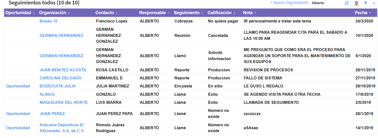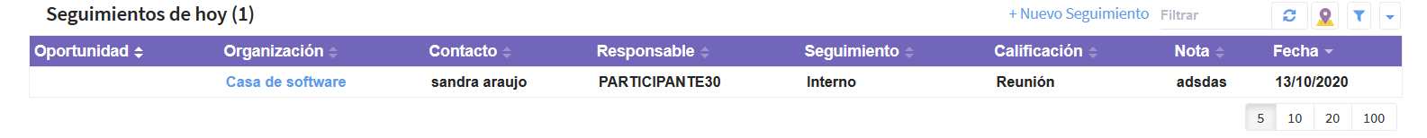 Seguimientos: aquí tenemos toda la evolución y desarrollo de un proceso, es decir, los eventos que hemos hecho. Una vez que realizamos una tarea agendada, debemos completarla y crear el seguimiento correspondiente o puedes realizar un seguimiento directo, es decir que no fue necesario agendar nada.