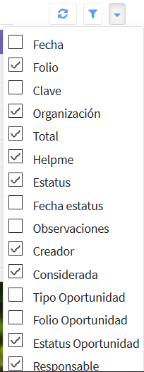 el cual nos despliega un pequeño menú en donde vamos a poder seleccionar cuales son las columnas que queremos que se nos muestre en la vista en la que nos encontramos, también podremos ordenarlas a nuestro gusto dependiendo que son los datos que más buscamos, para ordenarlas solo tenemos que arrastrarlas teniendo en cuenta que la que aparece en la primera posición en la lista, es la columna que aparece a la izquierda en la vista y así sucesivamente.