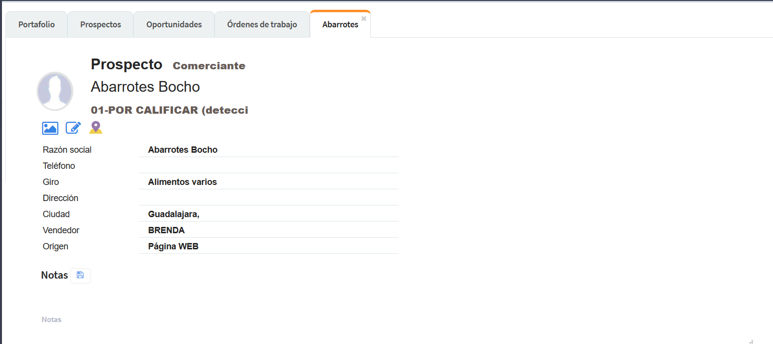 Ejemplo: Podemos modificar la Calificación del prospecto para indicar que ya no es “Por calificar” si no “Calificado”.