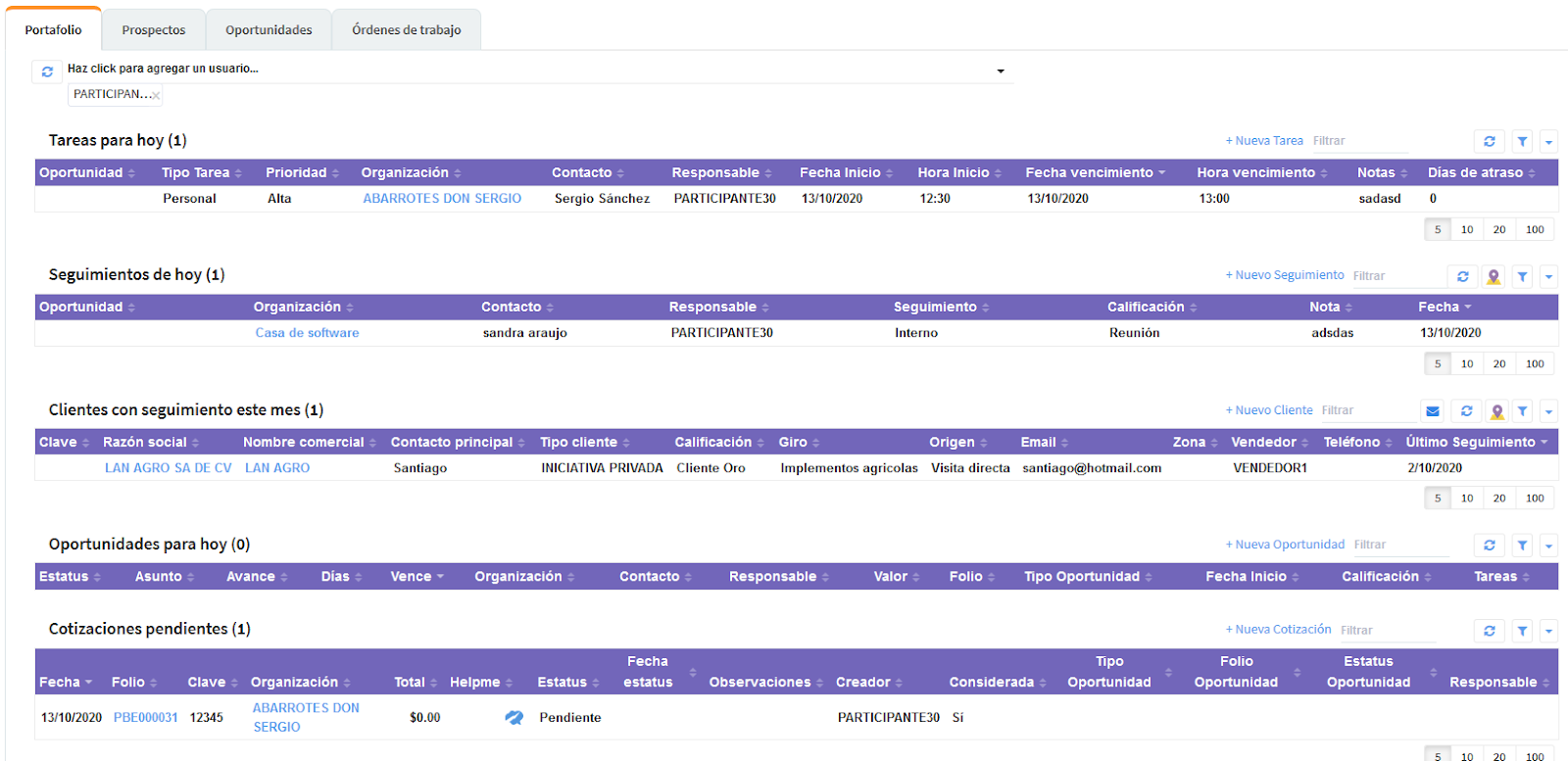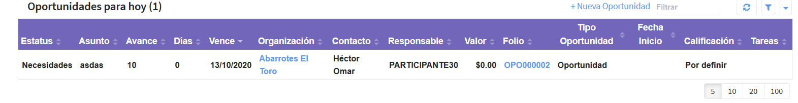 Oportunidades: en este apartado encontraremos las Oportunidades que tenemos registradas, cada una con los datos de la organización para la que fue creada, el avance, vencimiento, la persona responsable de esa oportunidad etc.