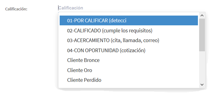 Calificación.- Aquí vamos a clasificar el prospecto definiendo su perfil dependiendo de en qué etapa nos encontremos con nuestro prospecto, la cuál normalmente sería “Por calificar” → “Calificado” → “Acercamiento” → “Con Oportunidad”.