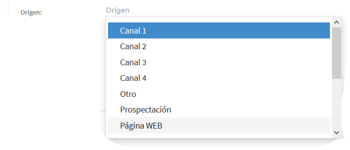 Origen.- En este apartado podemos elegir de donde captamos este prospecto seleccionando una opción de la lista desplegable.