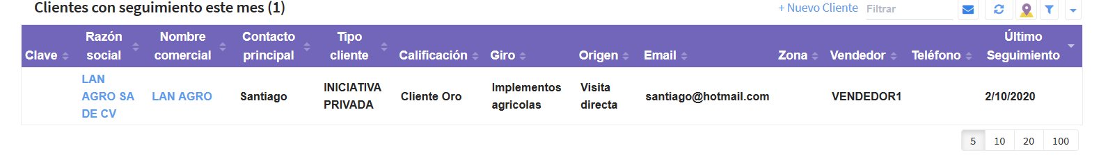 Clientes: aquí tendremos una lista de los clientes que tenemos en nuestro sistema administrativo, cada uno con su información de Razón social, su contacto principal, el tipo de cliente, su Email, etc.