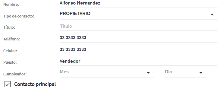 Primero ingresamos en la tabla la información que tengamos sobre nuestro contacto e indicamos si es el contacto principal o no de la organización.