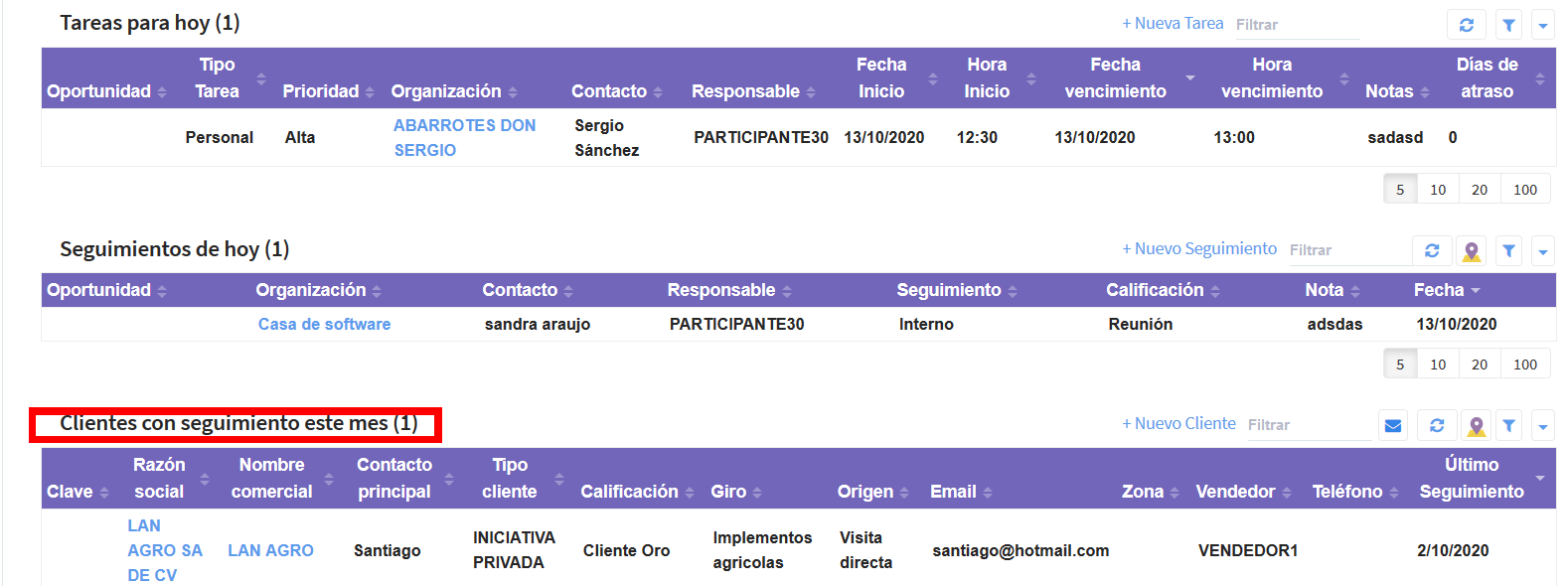 Ejemplo: Si deseamos mover la pestaña de “Clientes con seguimiento este mes” a la parte de arriba, sobre la pestaña “Tareas para hoy” damos clic en el título de la vista marcado con el recuadro rojo y lo arrastramos a la parte de arriba .