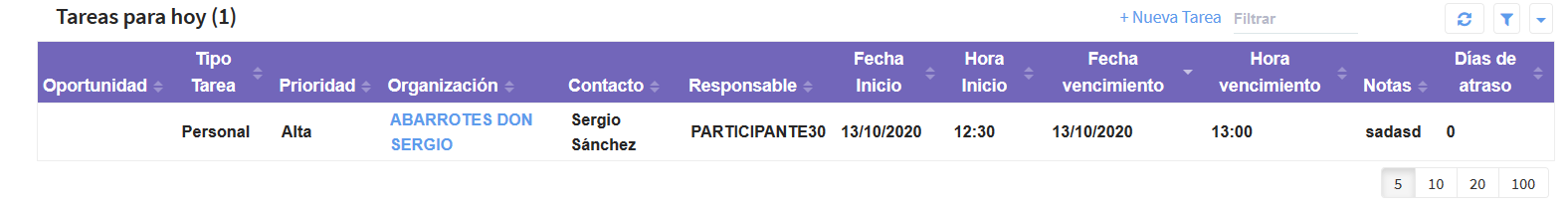 El título de la vista está formado por el nombre de la misma, concatenado con el filtro que se está usando y la cantidad de registros filtrados entre paréntesis. Tomando como ejemplo la captura de la vista de tareas tenemos “Tareas para hoy (1)”.