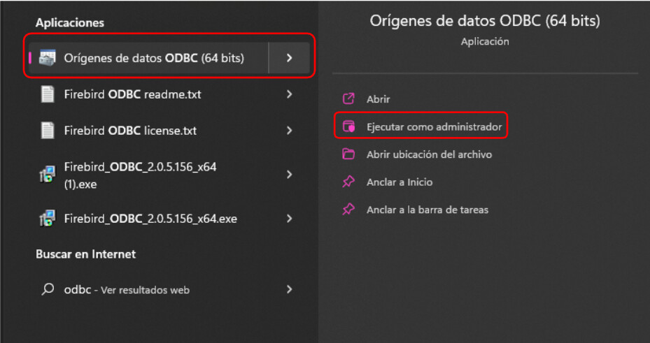 Vamos a configurar los Origenes de datos utilizando la aplicación de ODBC Driver de Firebird para configurar la conexión.