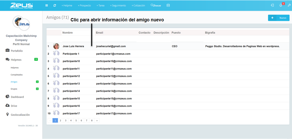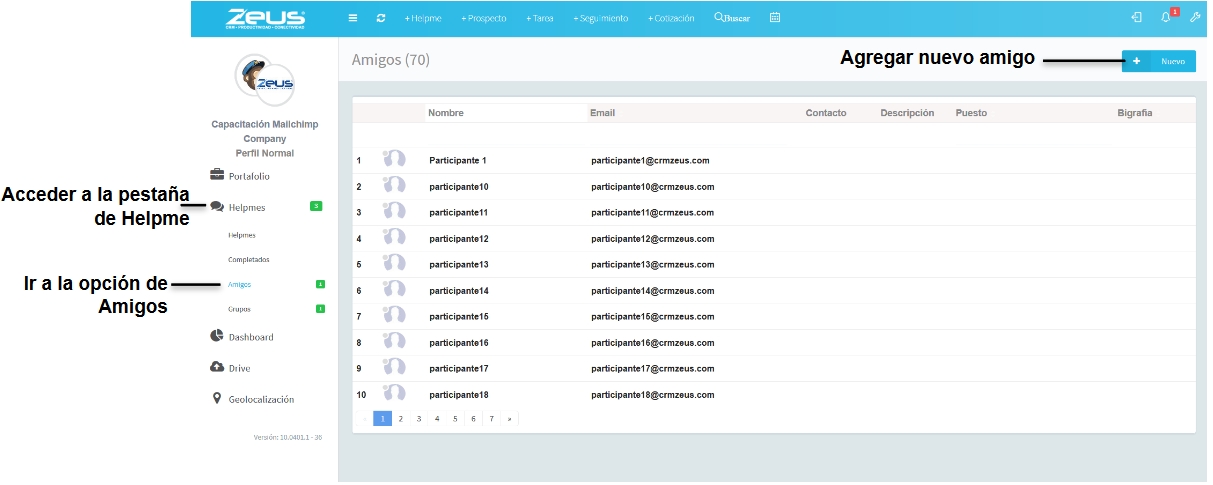 El usuario administrador se dirige al menú “HelpMe” en la parte izquierda de la pantalla, luego hacemos clic en “Amigos”, en el lado derecho seleccionamos “Nuevo”, lo que nos llevará a la ventana de búsqueda de usuarios.