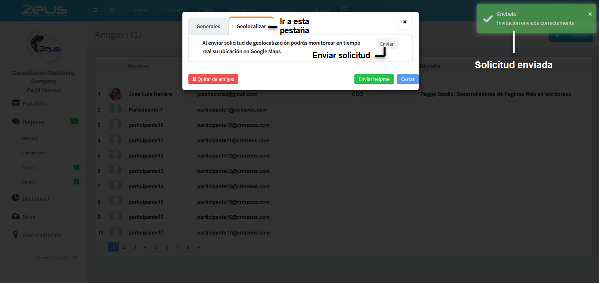 En la ventana que aparece el usuario administrador el que supervisa tiene que dar clic en la ficha “Geolocalizar” y luego clic en “Enviar”, se mostrará un mensaje indicando que “La invitación se envió correctamente”.