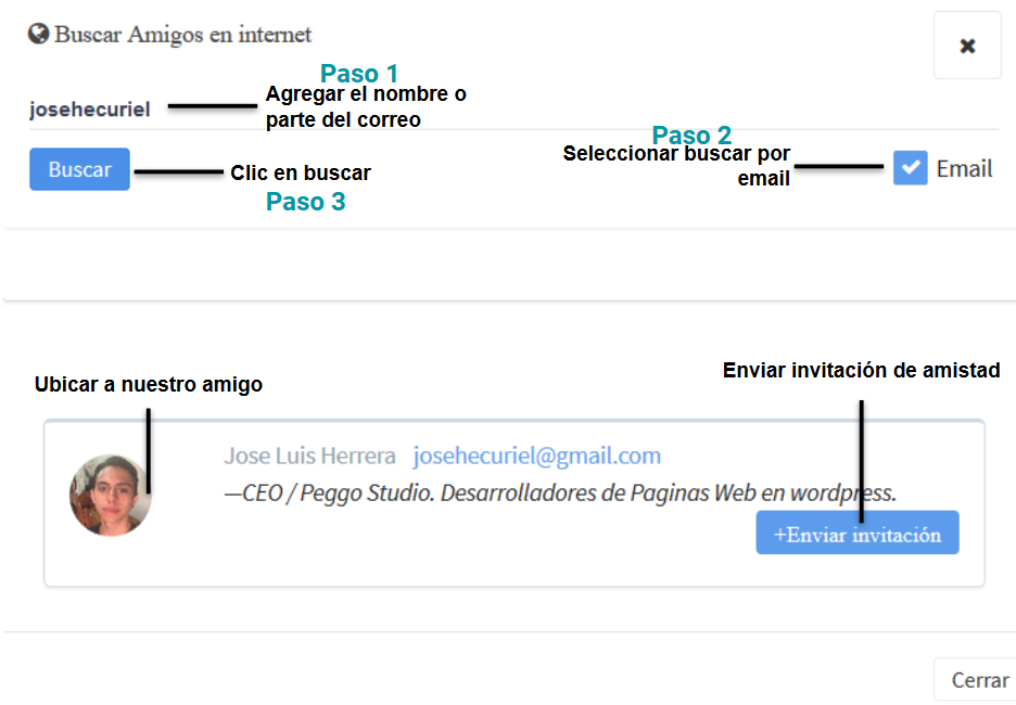 Una vez en la ventana de búsqueda escribimos parte del nombre del usuario, si queremos buscar por el correo activamos la opción “Email” y hacemos clic en “Buscar”, en los resultados ubicamos al usuario y le enviamos invitación de amistad haciendo clic en el botón “Enviar invitación”.