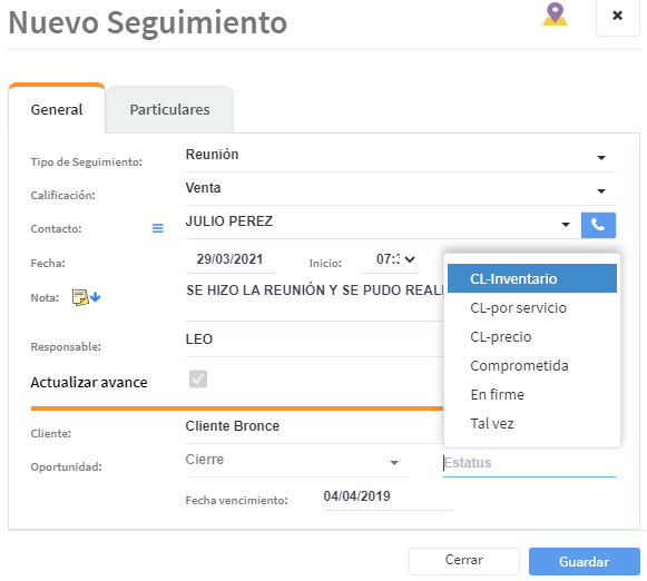 Llenar los datos del seguimiento, cambiar el Estatus y guardar (En este caso la Etapa no se puede cambiar, sigue siendo la misma, solo se avanza el Estatus)