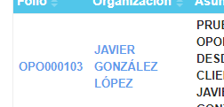 Filtro de texto: nos permite filtrar la información en base a una palabra o texto indicado. El filtro se aplica mientras se escribe y la búsqueda se hace en todas las columnas. En el siguiente ejemplo se encontró “cli” en la columna “Asunto” en los primeros dos registros y en la columna “Organización” en el tercero.