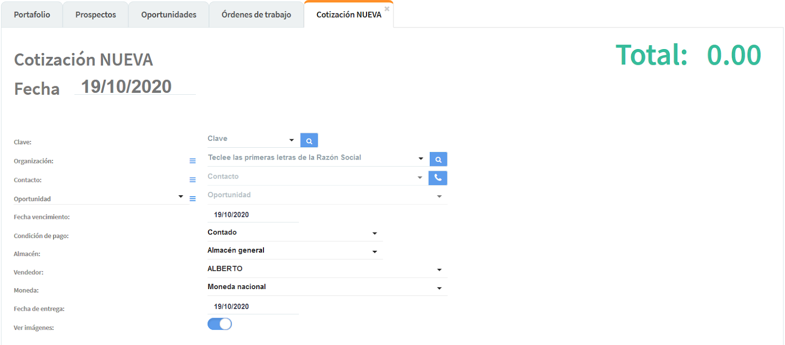 Una vez abierta la cotización vamos a seguir llenando los datos.