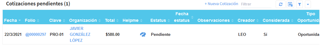 Al dar clic en Guardar nos regresará a la pantalla de Portafolio y si nos dirigimos a la vista de cotizaciones podremos ver que se encuentra nuestra cotización que acabamos de crear.