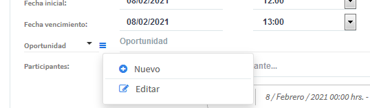 Ya en la tarea, si la tarea es nueva seleccionamos la Organización y el Contacto, luego en el campo Oportunidad, hacemos clic en el menú contextual y posteriormente en Nuevo