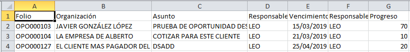 Columnas: muestran la información de los datos generales de la Oportunidad y las Etapas de las mismas.