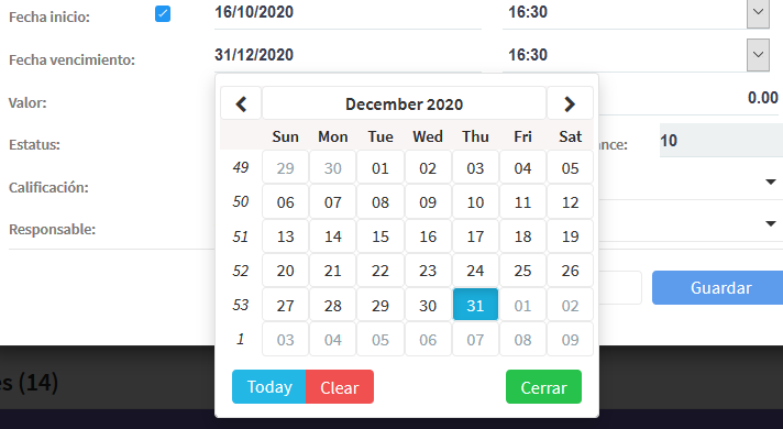 Al querer cambiar la fecha de vencimiento o inicio nos abre un pequeño calendario que nos facilitará elegir una fecha determinada.
