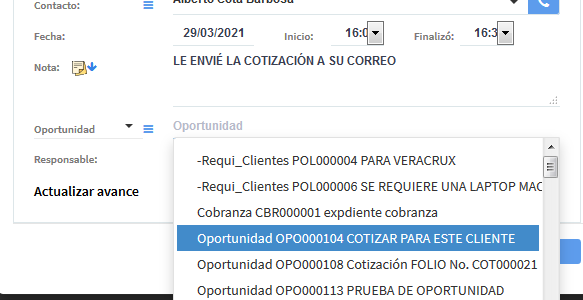 Ya en el seguimiento, si el seguimiento es nuevo seleccionamos la Organización y el Contacto, luego en el campo Oportunidad, Seleccionamos una Oportunidad de la lista