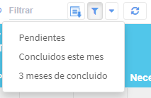 Filtros generales: nos permiten aplicar los filtros de Pendientes, Concluidos este mes y 3 meses de concluido.