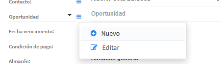 Ya en la cotización, en el campo Oportunidad, hacemos clic en el menú contextual y posteriormente en Nuevo