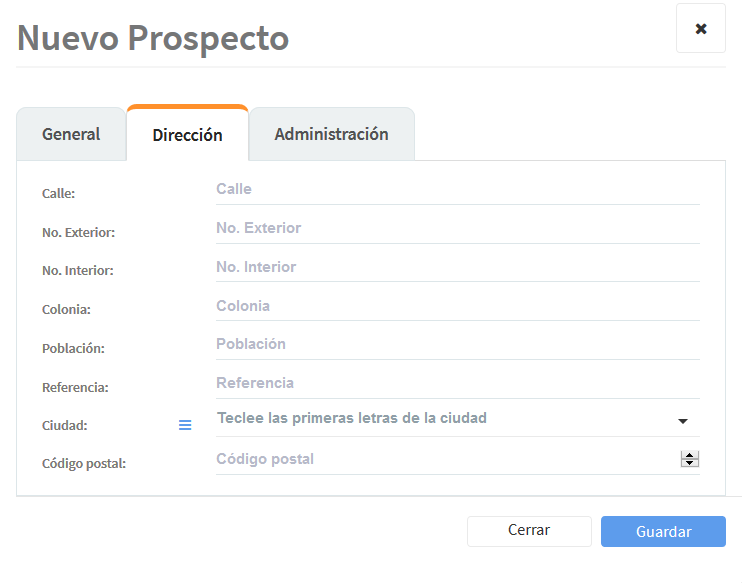 En la siguiente pestaña “Dirección” que encontramos en la parte superior de nuestro Modal podremos ingresar la Dirección del prospecto que estamos manejando si es que tenemos la información.