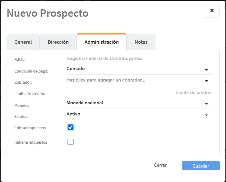 Por último tenemos la pestaña de Administración en donde nos permitirá poner los datos de facturación de nuestro prospecto.