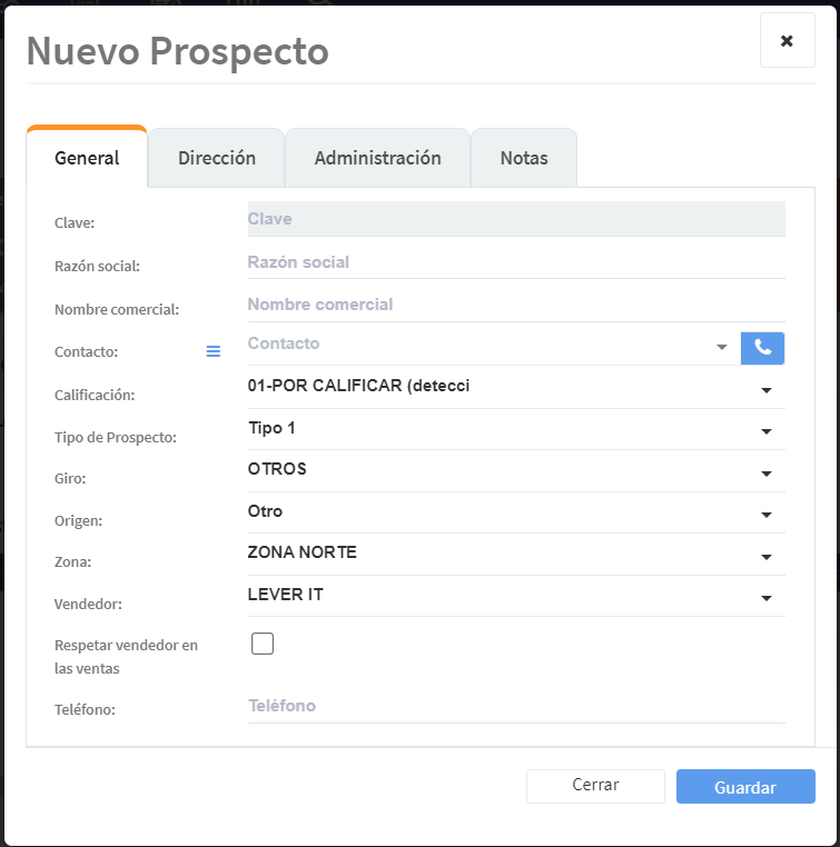 Clave.- En esta sección nosotros podemos poner una clave creada por nosotros o si el sistema está configurado así puede ser una clave consecutiva creada por el sistema para identificar al prospecto y que a la vez sea más fácil de buscar, mediante la clave y no por el nombre.
