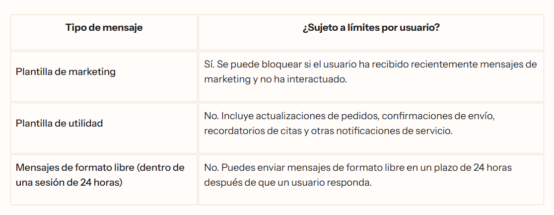 No todos los tipos de mensajes de WhatsApp están sujetos a límites de marketing por usuario.