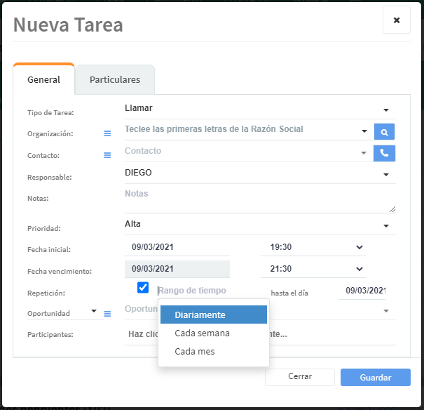 Se especifica la frecuencia con la que se repetirá la tarea (Diariamente, Cada semana o Cada mes)