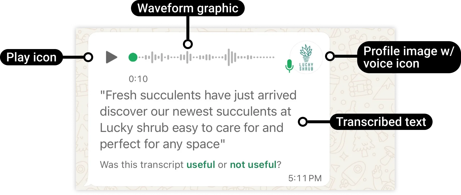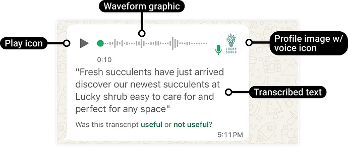 urlpropiedad. - Ahora puedes designar un mensaje de audio como un mensaje de voz . Los mensajes de voz entregados aparecen en el cliente de WhatsApp con un ícono de reproducción, un gráfico de forma de onda, una imagen de perfil y un ícono de micrófono. Si el destinatario lo ha habilitado transcripciones de mensajes de voz, también puede aparecer una transcripción de texto del mensaje: