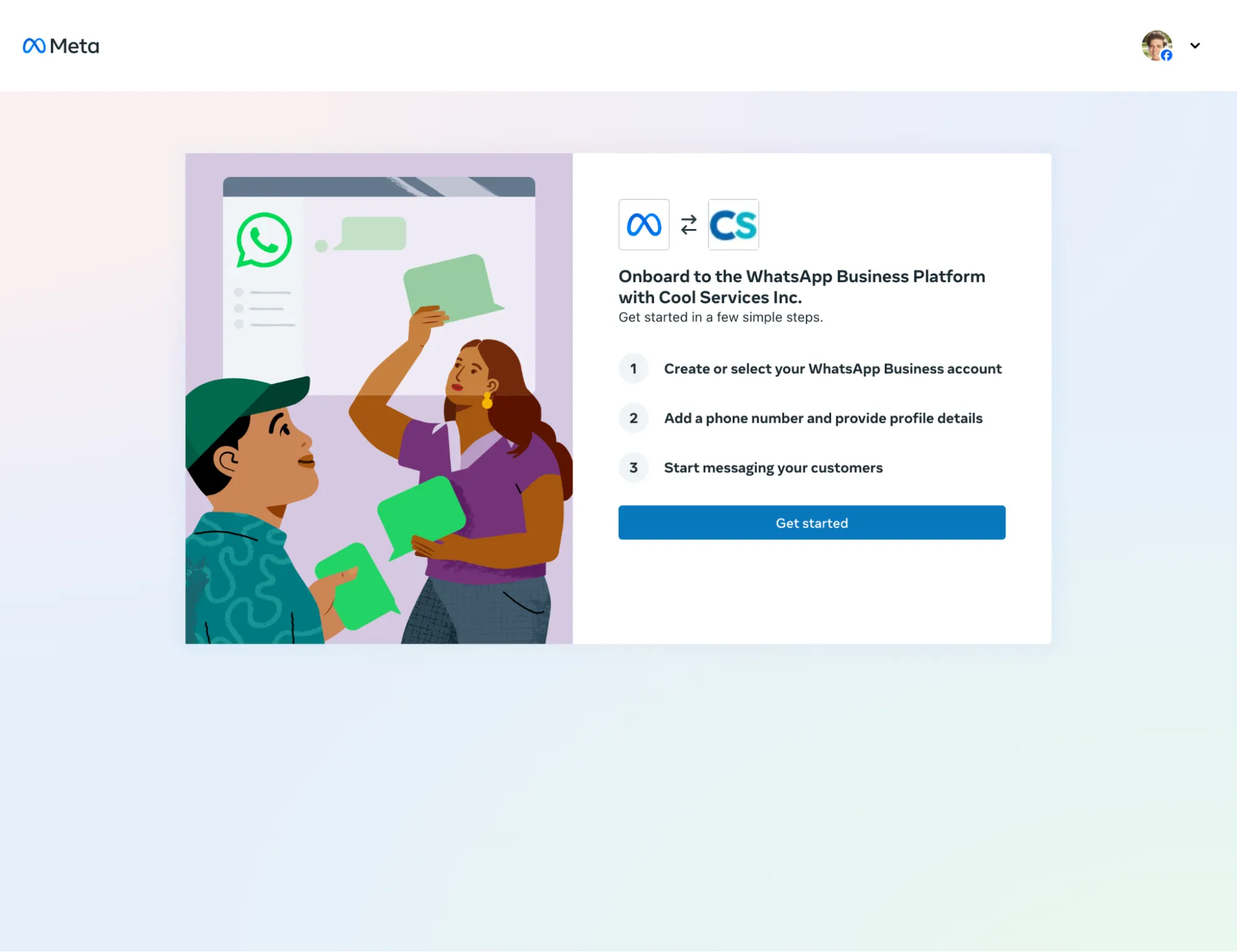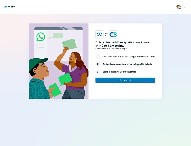 Hosted ES es una implementación preconfigurada de Embedded Signup alojada por Meta. Puede obtener un enlace a Hosted ES en el Panel de aplicaciones y agregarlo a su sitio web o portal de clientes. A los clientes comerciales que hagan clic en el enlace se les presentará una página web con un botón “Comenzar” que inicia el flujo de registro integrado: